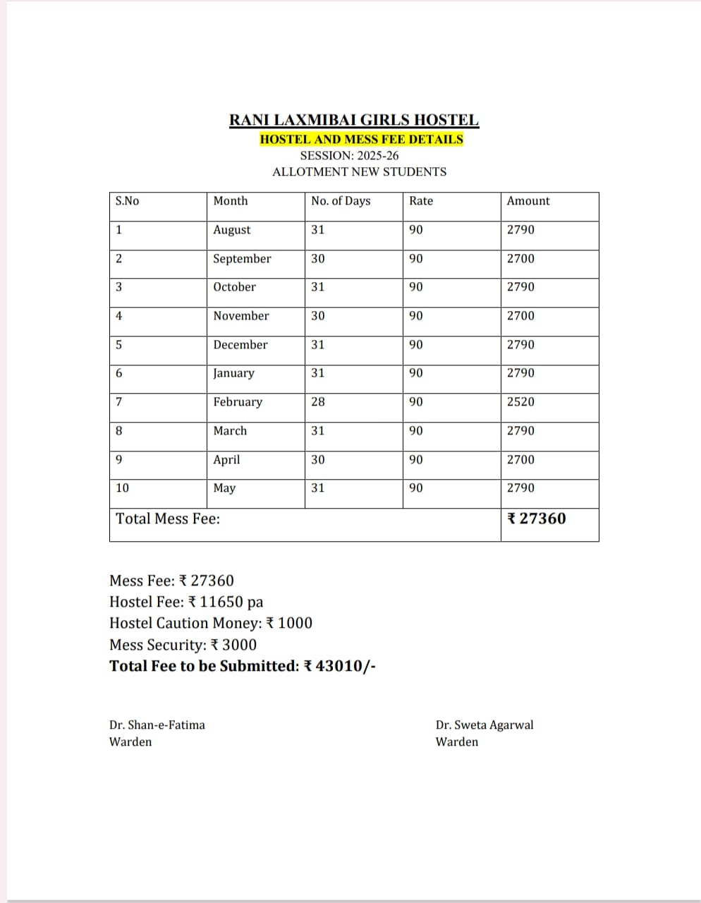 Rani Laxmi Bai Girls Hostel Fee Details | View/Download | |