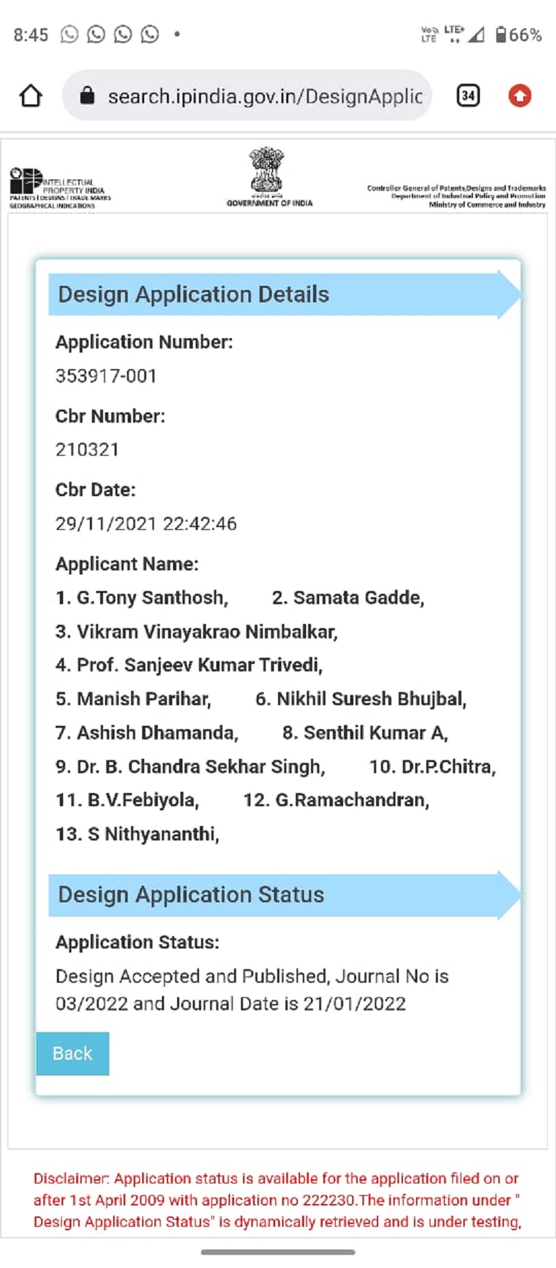 6247162 | Prof. S.K. Trivedi | Electrical battery operated two wheeler driven by internet of things | 08.12.2022 (Granted) | 6247162 | International | View/Download | |