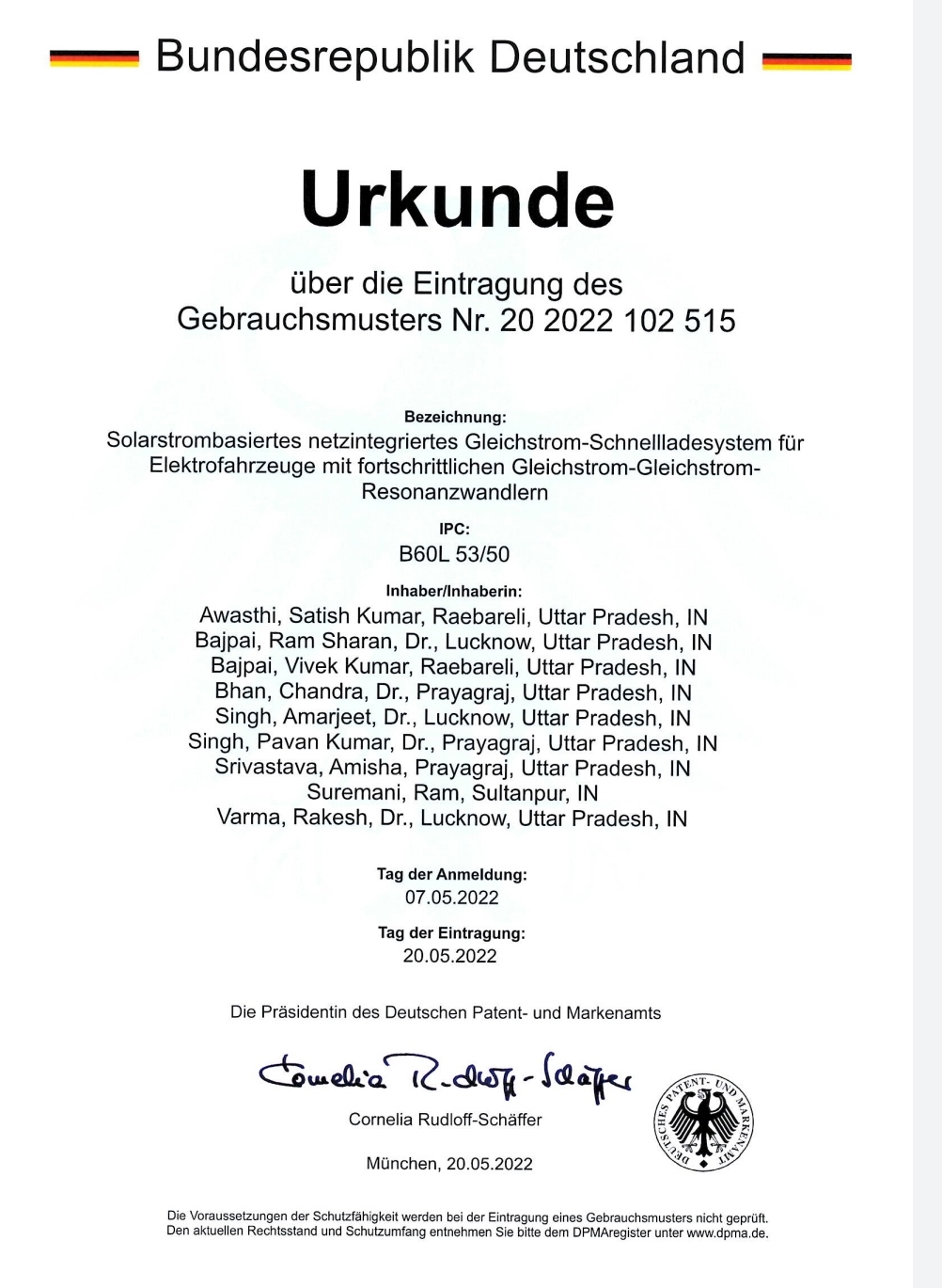 202022102515 | Mr. Vivek Kumar Bajpai | Solar Energy based grid integrated DC fast Charging Station for electric vehicles using advanced DC-DC resonant Converters | 30.06.2022 | DE 20 2022 102 515 U1 | International | View/Download | |